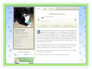 If you'd like something simpler, build a single photo memorial. Share a single favorite photo with unlimited copy to fully document those special times, daily walks, quiet times and playful activities for all to remember and cherish forever. Friends and family can leave notes of condolence and memories of your pet in the Memory Book. It's easy to create a Single Photo Memorial using our wizard creation tool. Click here to view a sample of the wizard.